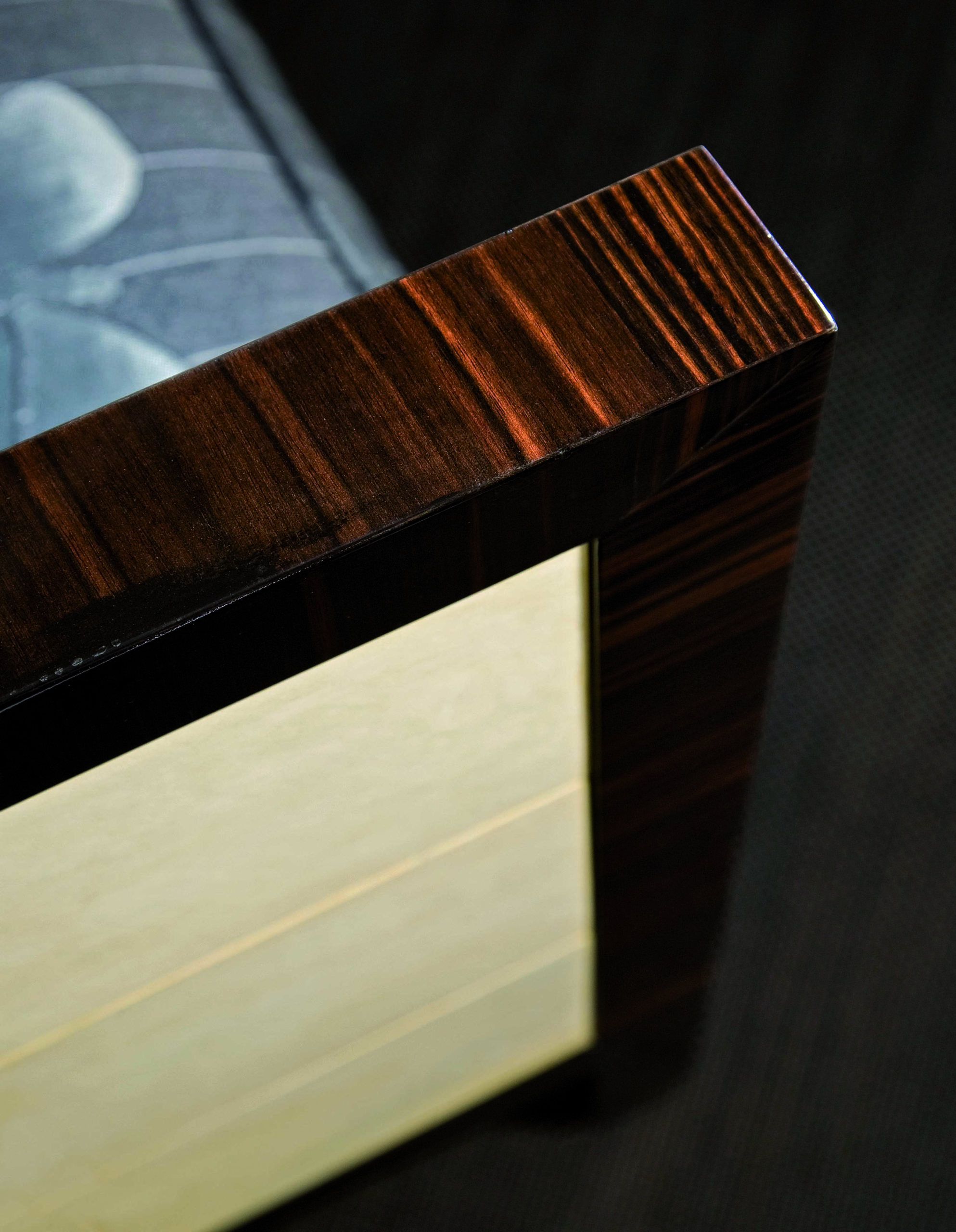 Poltrona squadrata con struttura in legno, bordata in ebano makassar e rivestita con riquadri pergamena e tessuto per la seduta e i bordi interni.